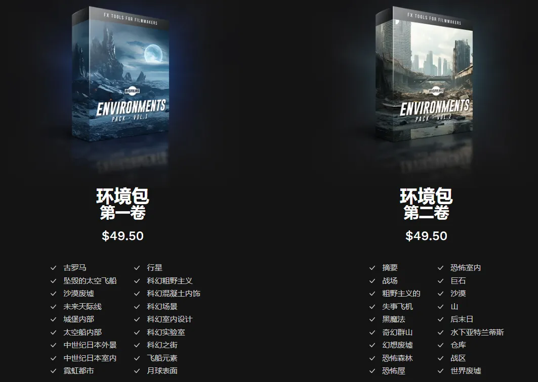 Environments Pack 旨在为电影制作人的绿屏镜头提供多种背景。我们将 AI 生成软件与传统工具相结合,创建了这 1,600 多张独特的图像。无论您是在制作短片、广告还是音乐视频,您总能在这 37 个史诗类别中找到您需要的环境!我们设计了极其广泛的环境:科幻、动作、恐怖、奇幻、中世纪、行星等等!我们所有的环境都是超高质量的 6K JPG 图像文件,始终为您的绿屏截图找到合适的背景。