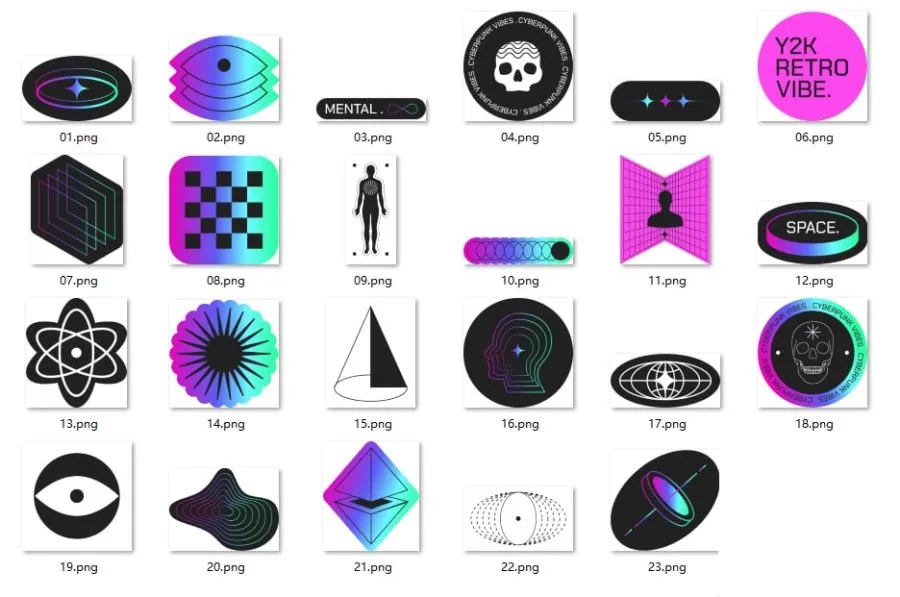 23 张 Y2K 全息徽章贴纸版本v.2 适用于包装设计、拼贴艺术、剪贴簿、贴纸、海报、明信片和所有创意设计。由于矢量形状和组织良好的图层,所有徽章都易于编辑、自定义和调整大小。