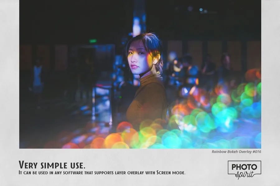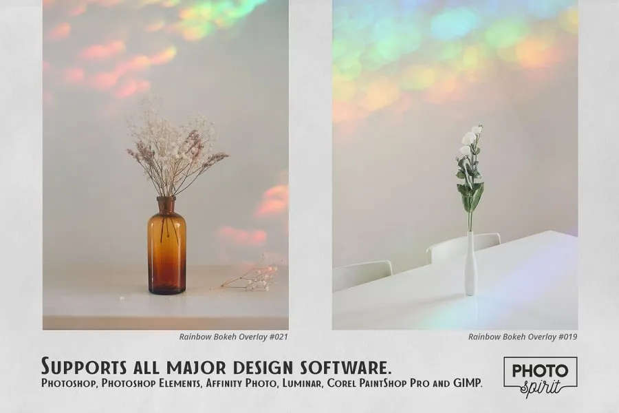 适合业余爱好者和专业人士。彩色和黑白照片上的效果极佳。为了方便起见,添加了在屏幕模式下选择和叠加叠加的操作。这在 Photoshop 和 Photoshop Elements 中均有效。彩虹散景效果叠加可用于任何支持屏幕模式下图层叠加的图形编辑器。