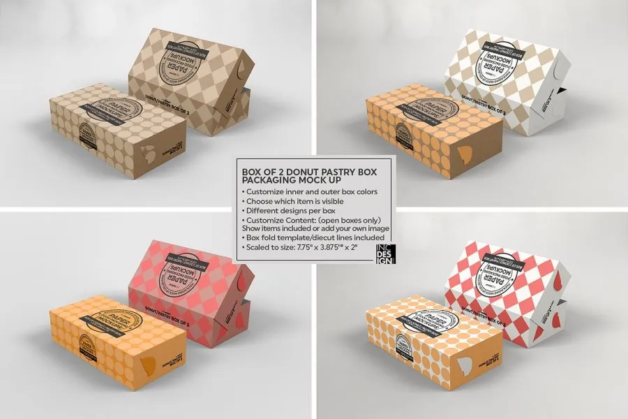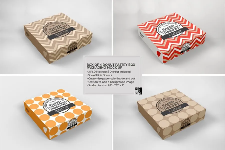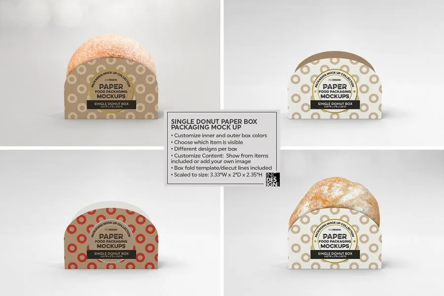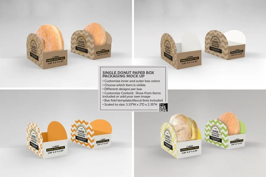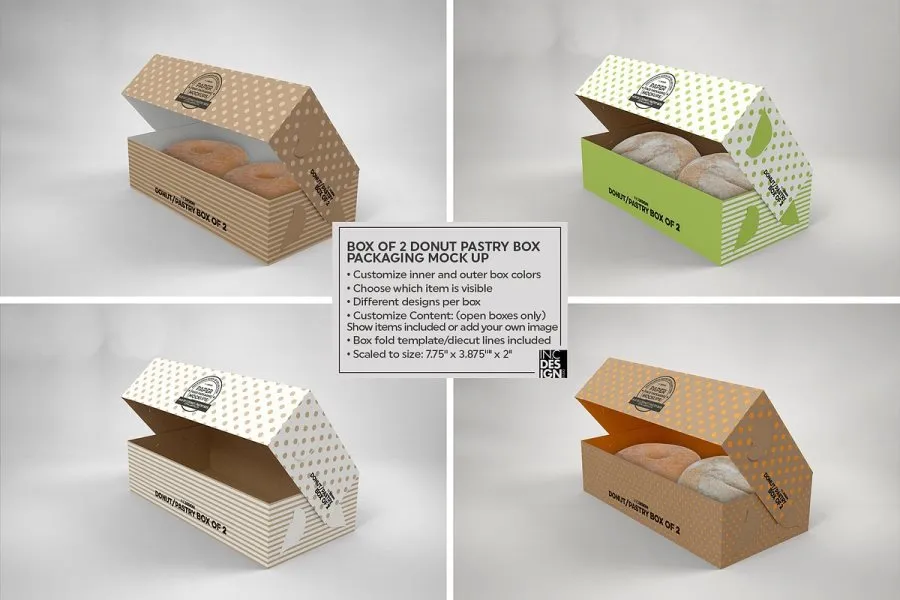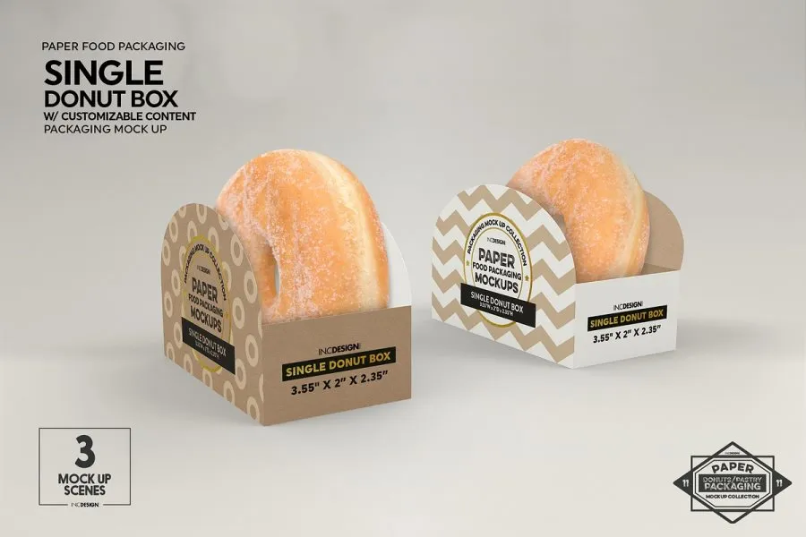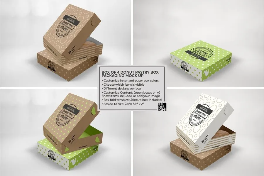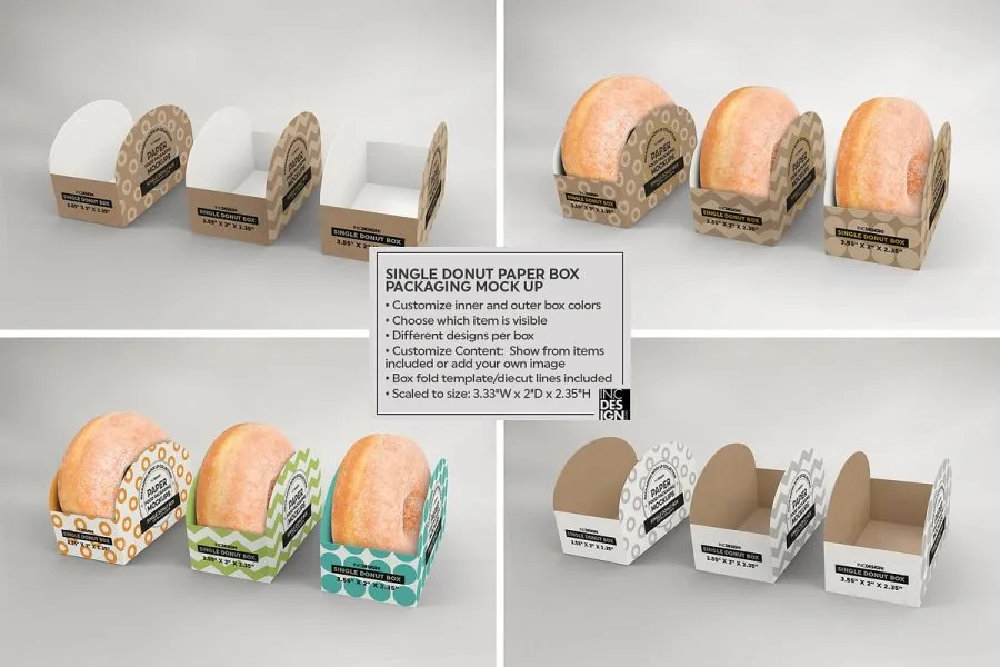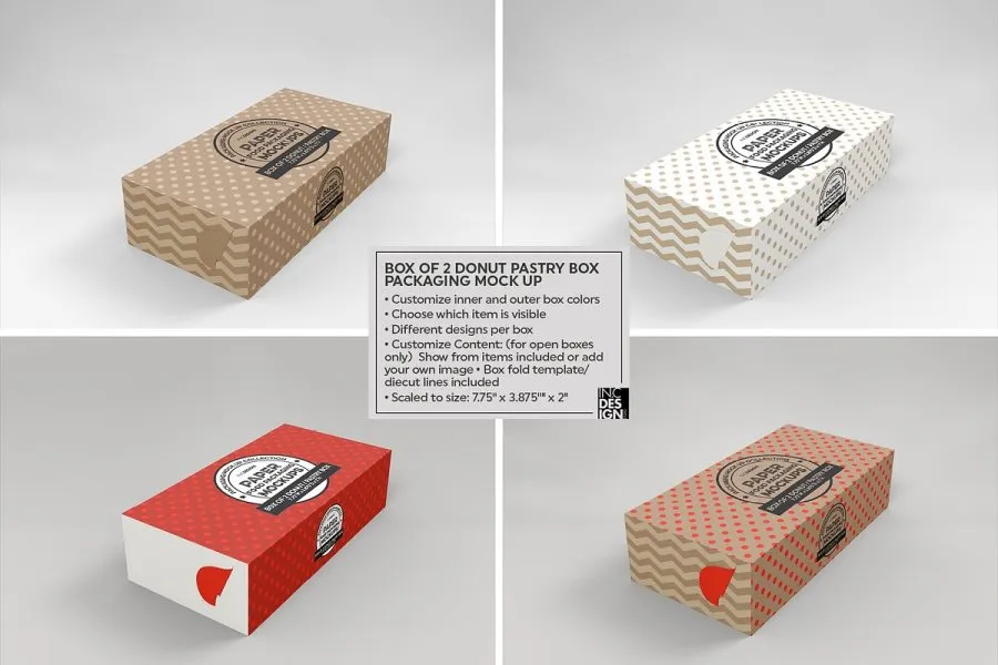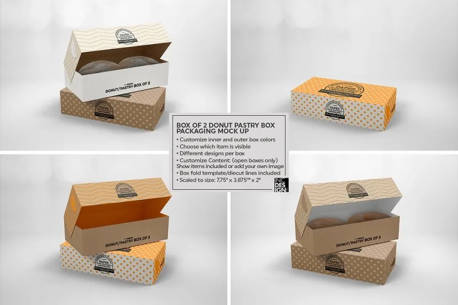 第 11 卷:纸质食品盒包装样机系列 – 甜甜圈/糕点盒 v11.1,包含了十 (10) 个分层 PSD 模型;3 种不同风格的盒子。这些都是高质量/分辨率文件 | 5400×3600 | 18”x12” | 300dpi;您只需选择添加您自己的背景图像,轻松更改背景颜色。包含盒式折叠模板,按比例缩放(折叠形状尺寸如下所示)。这些是空白的 psd 模板,可用于展示您的设计。预览图像上的设计仅供参考,不包含在内。这些模板最适合使用 Photoshop CC 2015 及更高版本