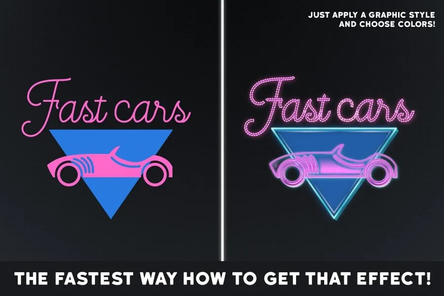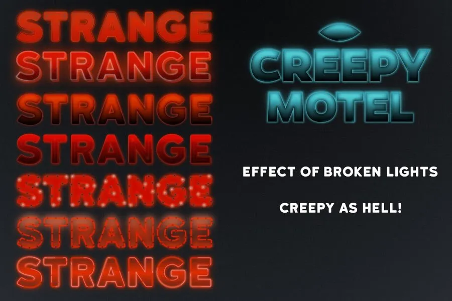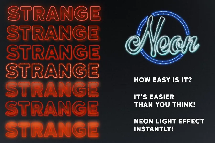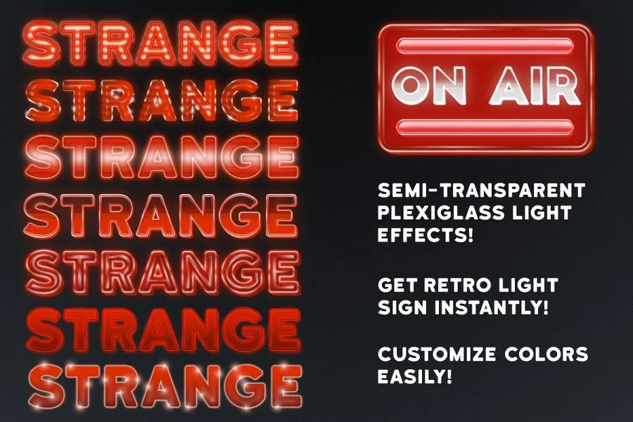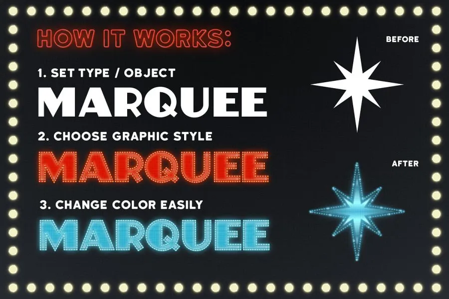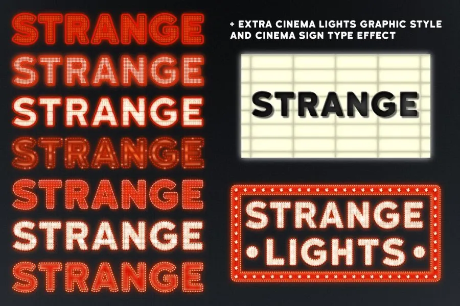 Strange Lights 是 Adobe Illustrator 的绝佳图形样式。受拉斯维加斯灯光、复古汽车影院标志和 80 年代图形的启发,我制作了这组强大的图形样式。您可以轻松创建华丽的文本标题并自定义颜色。借助这些出色的高品质样式,您可以立即获得霓虹灯和灯光标志效果!适用于 CS6 及更新版本。它们包括: