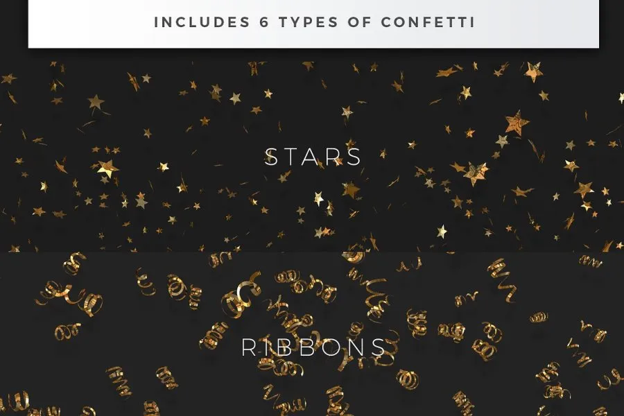 6 种风格的透明 PNG 五彩纸屑叠加层。将这些透明五彩纸屑 PNG 拖放到您的作品中,立即营造出爆炸性的派对氛围。