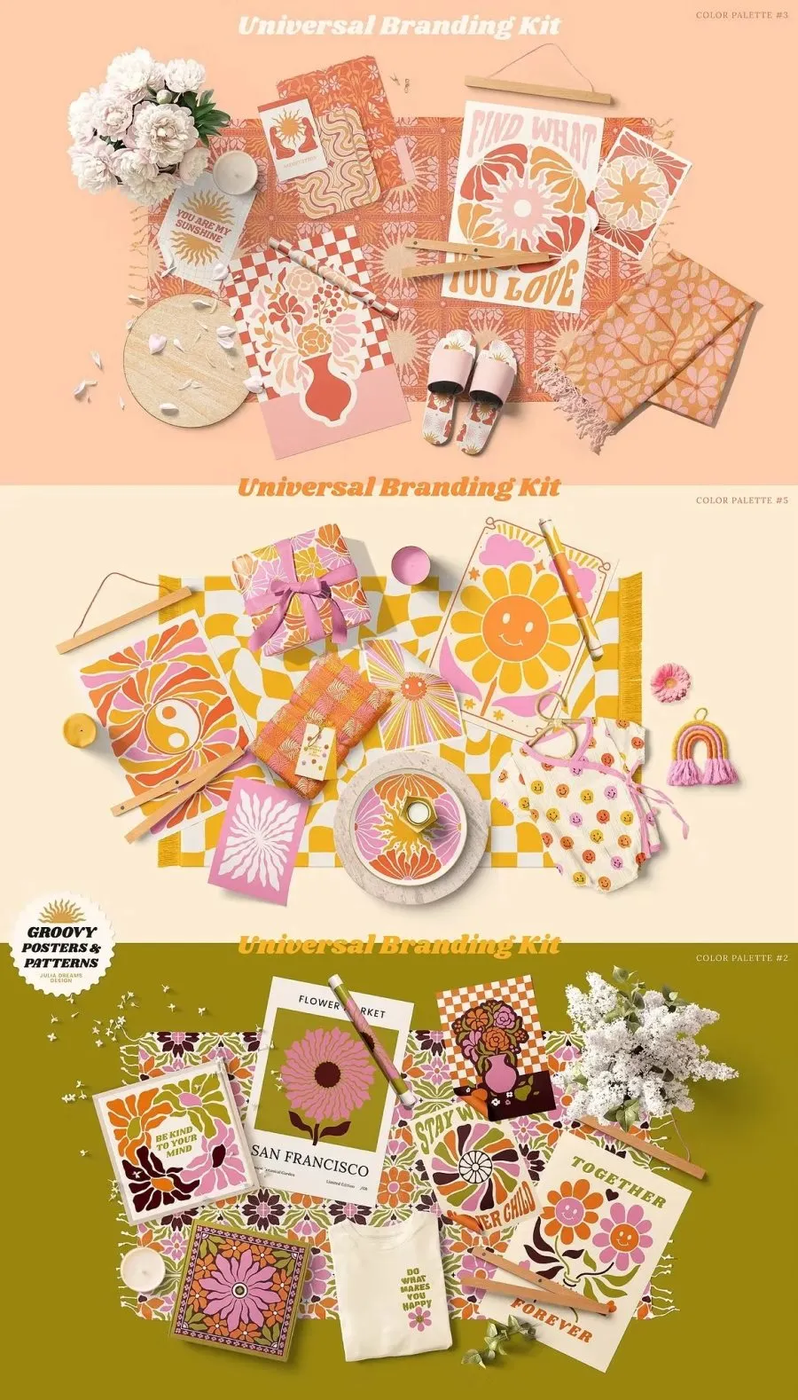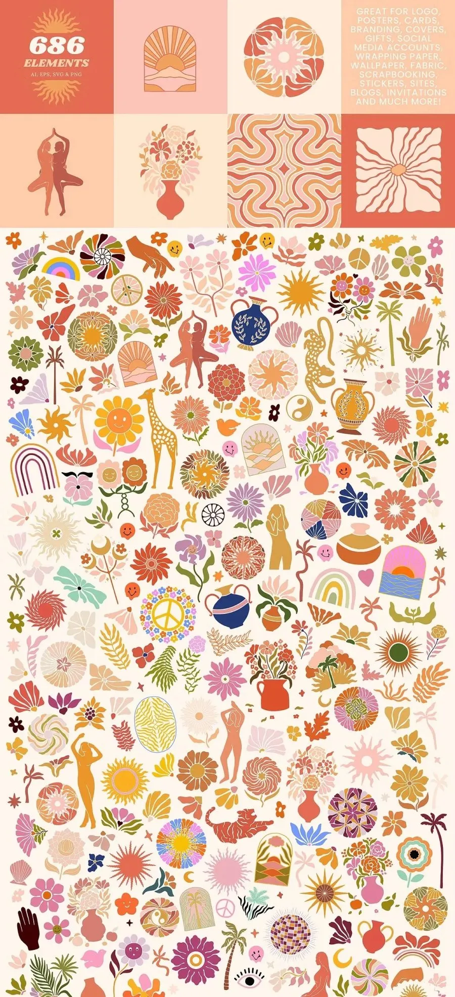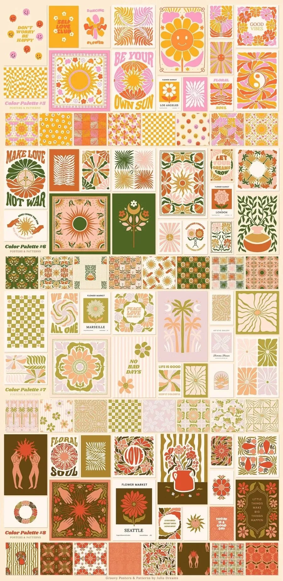 欢迎来到Groovy 海报和图案包- 一个包含 1160 多种图形物品的大型集合,灵感来自 70 年代、复古和自然!很棒的工具包,助您开创自己的事业!该系列制作精良,注重细节。它由不同的预制海报、元素和无缝图案组成,可以单独使用或与其他元素组合使用。