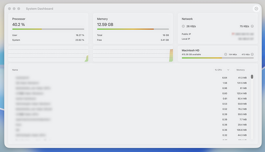 System Dashboard 是一款全面的系统监控工具,旨在提供用户实时监控计算机性能和系统状态的能力。通过直观的界面和丰富的数据可视化,用户可以轻松获取 CPU、内存、硬盘和网络等各项系统指标的信息。无论是个人用户还是IT专业人员,System Dashboard 都能帮助用户更好地理解和优化系统性能。