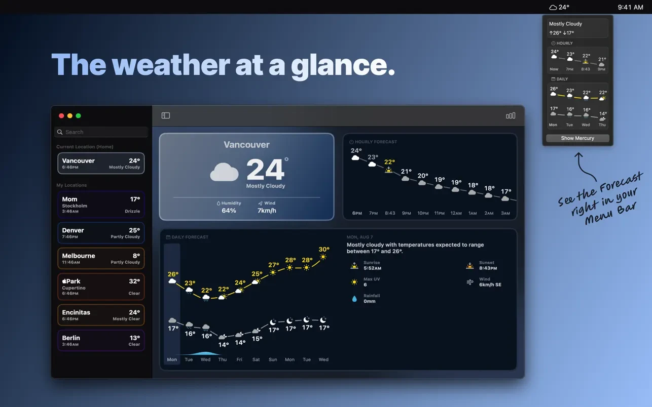 可保存多个地点用于快速查看天气。Mercury 在 iOS、macOS 等平台上为用户提供一致的体验。 - 天气数据展示