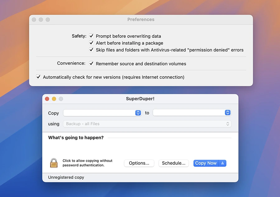 在实际使用中,SuperDuper(Mac版) 展现出极高的稳定性与易用性。用户无需具备复杂的磁盘操作知识,只需选择源磁盘和目标磁盘,即可一键启动完整备份或增量克隆。整个操作过程中界面简洁明了,所有选项和提示都非常清晰,特别适合不熟悉命令行工具的用户。它的“Smart Update”功能可以在保持备份完整性的前提下,仅同步变更内容,大幅节省时间。即使在最新的 M3 芯片 Mac 上,备份过程依旧高速稳定,且支持制作可启动副本,为系统恢复提供强有力保障。
