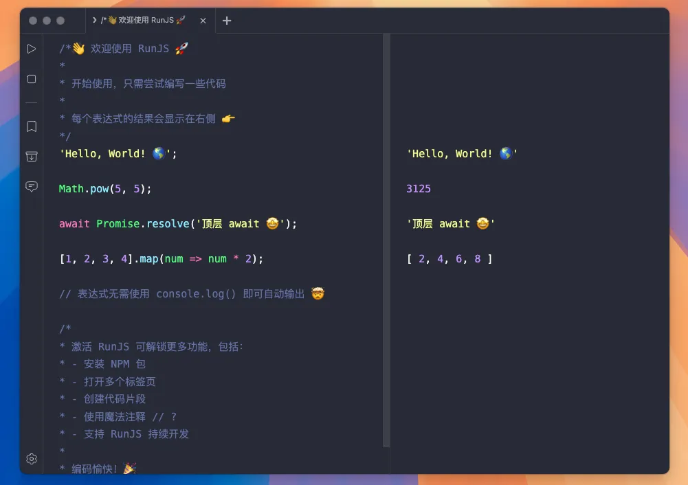 RunJS 是一款面向现代开发者的 JavaScript 与 TypeScript 实验工具,凭借其实时运行、易用界面和原生 Node.js 特性,为前端与全栈开发者提供了高效的代码测试平台。其在 Mac 系统上的出色表现,结合简洁设计与强大功能,使其成为日常开发流程中不可或缺的辅助工具。
