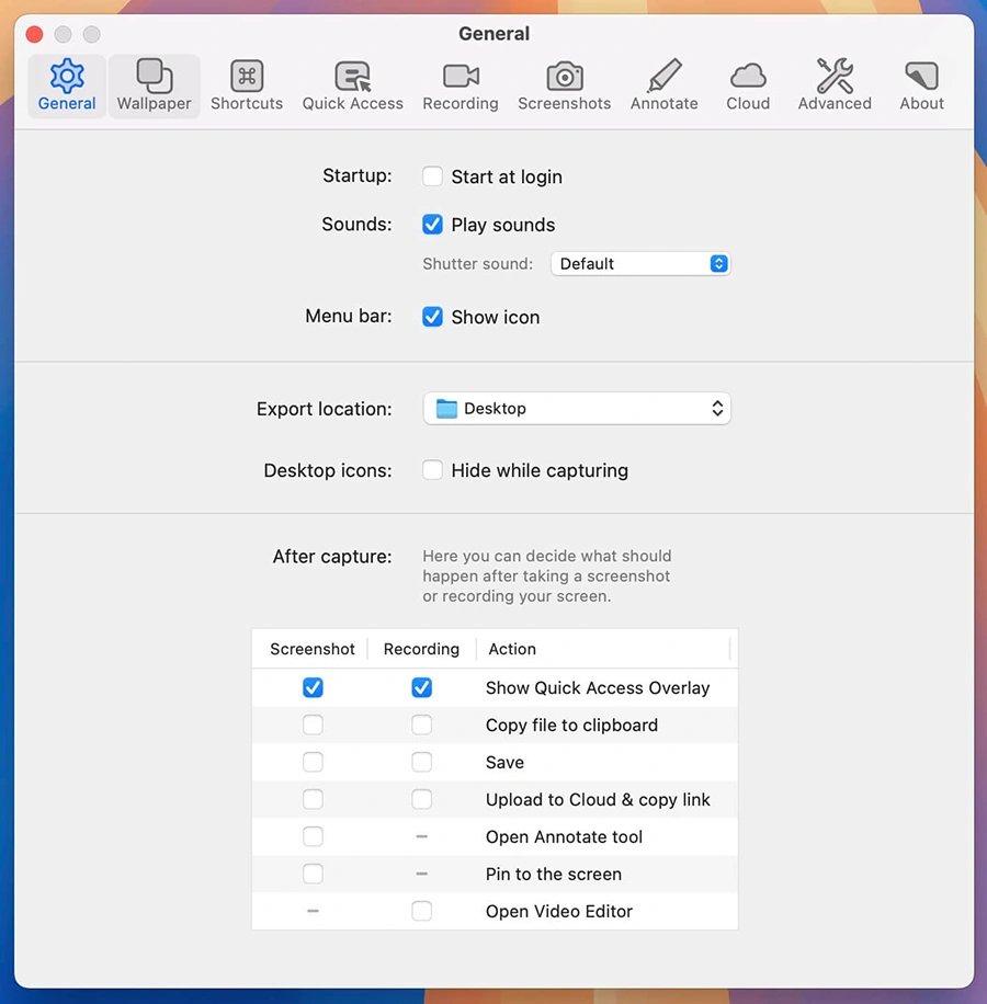 在 Mac 上使用 CleanShot X,你会很快感受到它的流畅与贴心。截图完成后会出现一个悬浮缩略图,可以直接进行标注、复制、保存或上传,避免了繁琐的操作步骤。滚动截图、隐藏桌面图标、录制屏幕与声音等功能切换自然顺畅,整体界面干净直观,不会让人觉得复杂。录屏时还能加入摄像头画面和鼠标点击效果,做教程或演示特别方便。整体体验下来,它既专业又轻便,完全融入 macOS 的使用习惯。