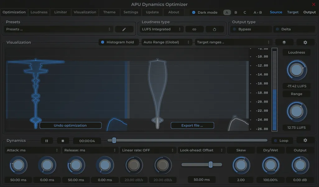 APU Software Dynamics Optimize Mac是一款支持现代音量度量(LUFS、True Peak)的动态优化器。