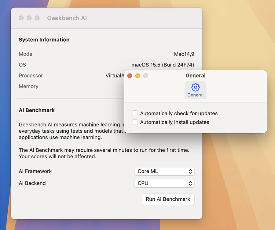 在 macOS 上使用 Geekbench AI,用户会感受到操作的直观与结果的权威。界面设计简洁,主界面显示 CPU、GPU 和 AI 测试选项,启动测试只需一键即可完成。整个测试过程高效且稳定,即使长时间运行大型 AI 模型模拟任务,也不会造成系统卡顿。测试结果清晰呈现分数、分项指标和历史记录,让用户能够轻松理解 Mac 在不同任务下的表现。界面风格与 macOS 系统保持一致,操作流畅自然。