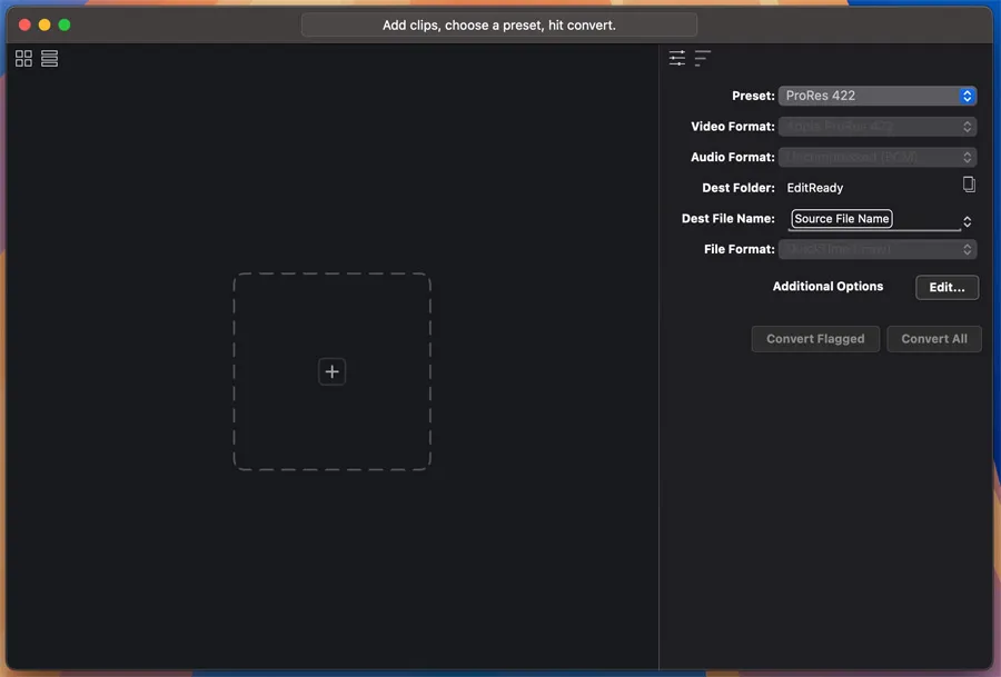 在 macOS 上使用 EditReady 的体验简洁流畅。软件启动迅速,UI 界面直观易用,支持拖拽素材文件到主窗口即可开始设置。用户可快速选择输出格式、码率、颜色空间转换等预设,并可对批量文件应用统一配置。Apple Silicon 优化让高分辨率素材(如 4K/8K ProRes)处理速度显著提升,同时占用资源低,不影响其他程序运行。程序还支持实时预览与校验剪辑决策,帮助用户直观判断输出效果,高效衔接后续剪辑工具。