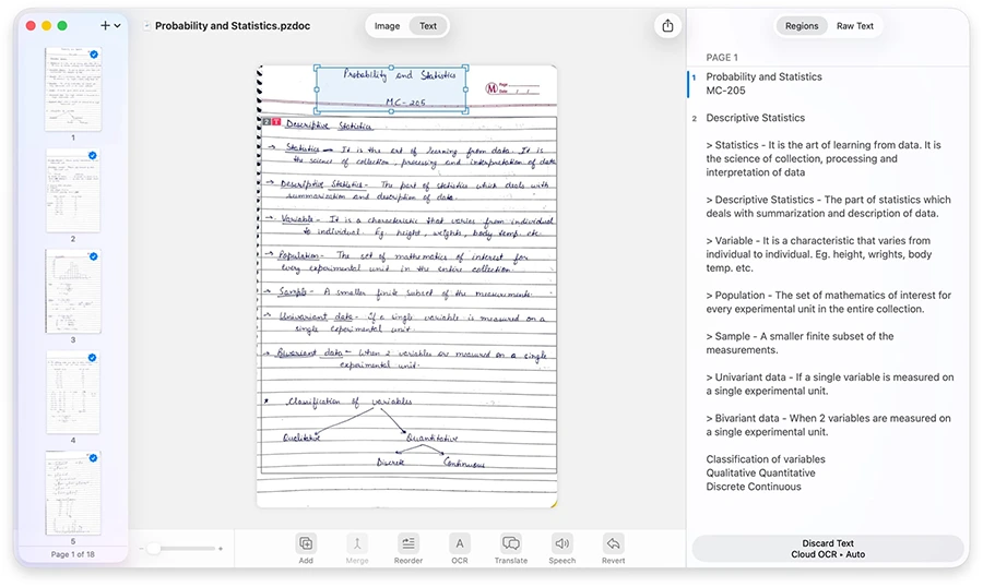 使用云端OCR选项时,Prizmo不仅支持上百种语言,还能带来无与伦比的手写识别功能。即便是同时包含标准印刷文本和手写文本的文件,也能以极高的人类水平准确率进行识别。在手写笔记中搜索文本从未如此简单。