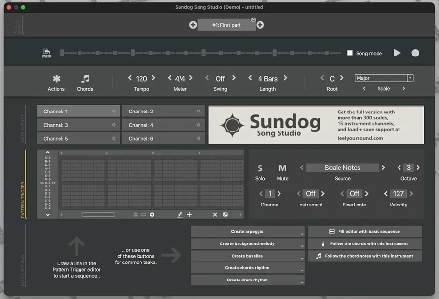 Sundog Song Studio 是一个方便的音乐创作程序,可以帮助您快速生成和弦、旋律、低音线和节奏序列,即使您不了解音乐理论。它作为一个独立的应用程序工作,或通过MIDI连接到任何工作室,将现成的音符直接发送到项目。