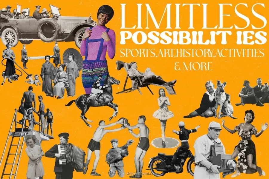 您想访问非凡的复古人物剪切图像集来创建动态和令人印象深刻的拼贴画吗?将资源拖放到画布中,即可快速创建精美的拼贴画。使用大量情感、活动和种族创作独特的艺术品!所有资产都非常详细,长边尺寸从 2000px 到 12000px 不等。没有锯齿状或模糊的边缘,因为图像被彻底分离