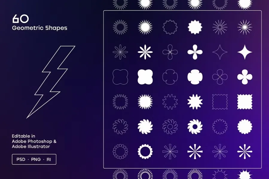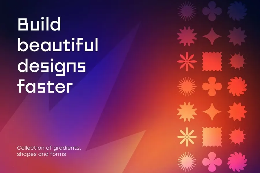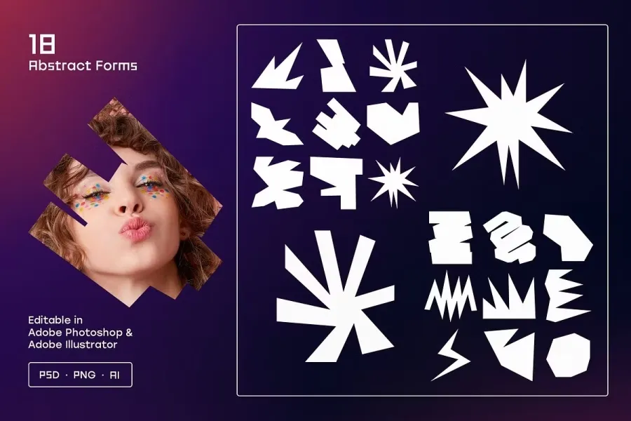 适用于 Adobe Illustrator 和 Adobe Photoshop 的 10 个现成渐变集合。 作为渐变纹理的一个很好的补充,该包包含 18 个抽象形式(Ai、PSD、PNG)和 60 个几何形状,可在 Illustrator 和 Photoshop 中编辑。使用这些精美的图形元素,更快地为您的品牌、产品、网站、社交媒体等设计和构建一些很棒的内容。