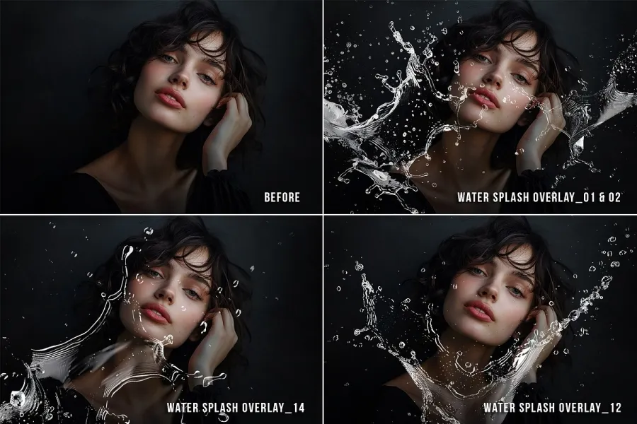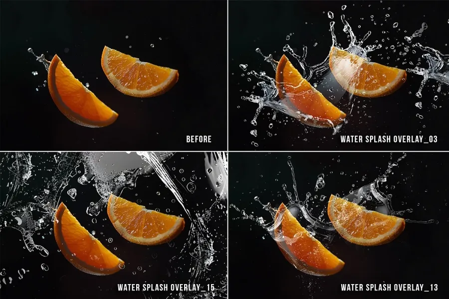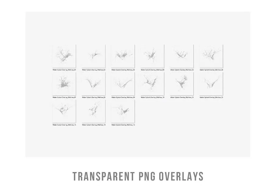 15 水溅 PNG 剪贴画,水溅透明 PNG 照片叠加,适用于产品摄影道具和照片背景的 photoshop 叠加效果。这些覆盖层与流行的照片编辑软件兼容,例如 Photoshop、Photoshop Elements、GIMP、Photopea、Canva 等,该系列确保业余爱好者和经验丰富的专业人士都能轻松使用。
