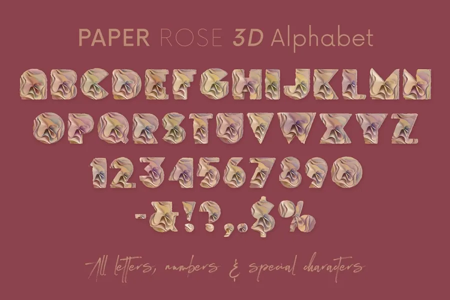 高分辨率逼真的 3D 创意、浪漫、有趣、女性化和纸玫瑰字体渲染(3000×3000 像素 – 但字体尺寸略小)。非常适合您的标题、海报、广告 – 任何网络或印刷项目。