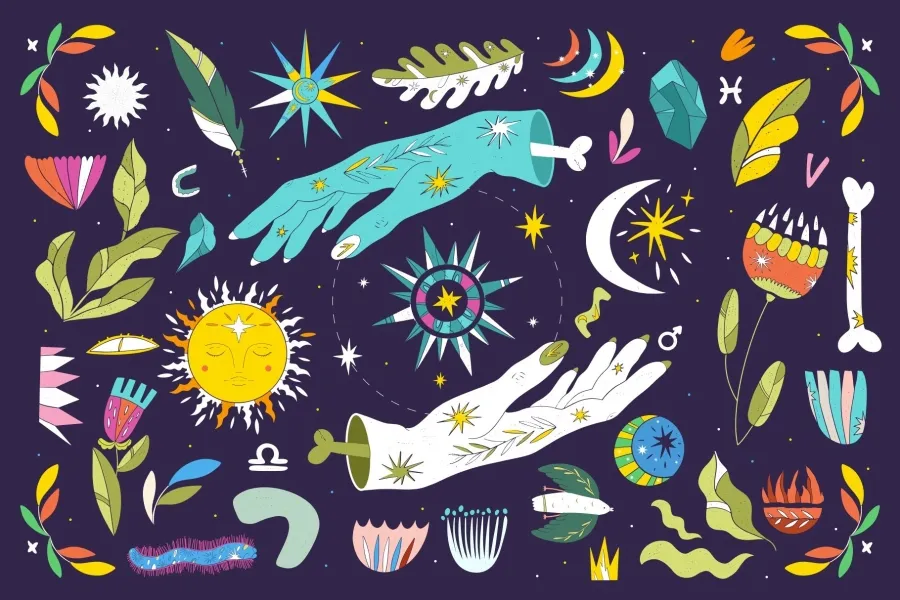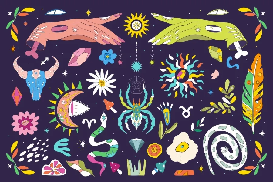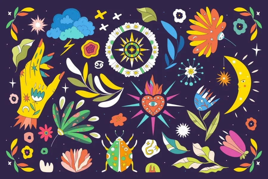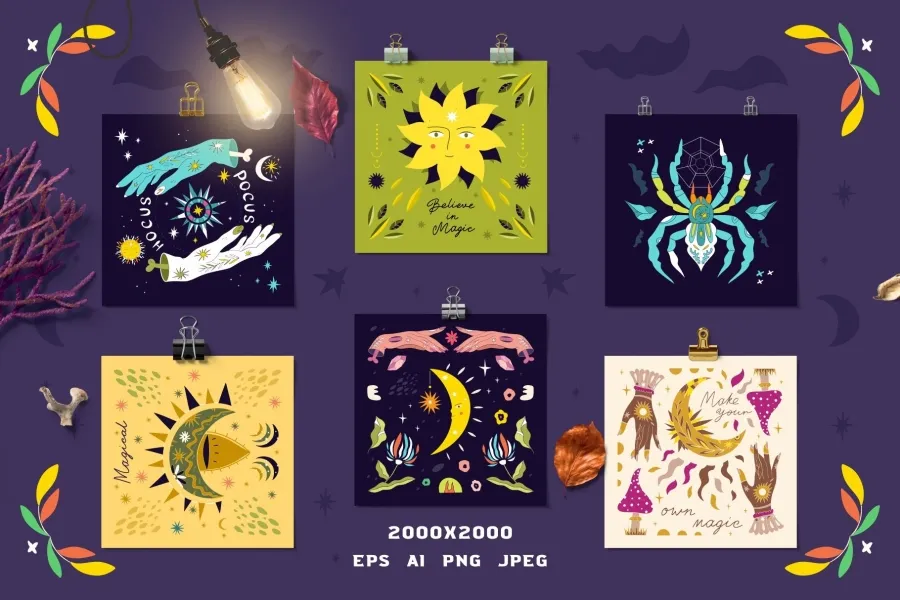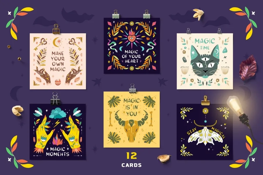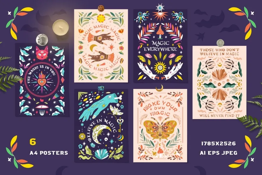 所有元素都是手绘的,并以相同的风格数字化,并且彼此完美结合。使用产品中的现成模板或为您的业务、纺织品、包装纸、贺卡、博客设计和其他东西创建自己的设计。为您的业务或室内设计创建品牌。