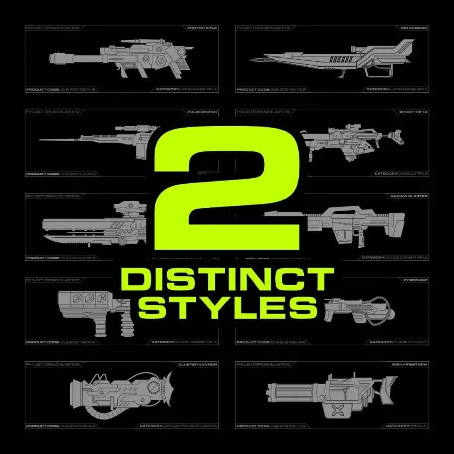 受未来主义和虚构射击游戏和机甲的启发,Dreadlabs 为您带来了 Dread Blasterz:一个包含各种步枪和爆能枪的矢量包。用激光束、霰弹枪和火焰喷射器填充您的作品和海报的网格,以营造工业未来主义风格。矢量包的灵感来自《无主之地》、《使命召唤》和《高达》等系列游戏。