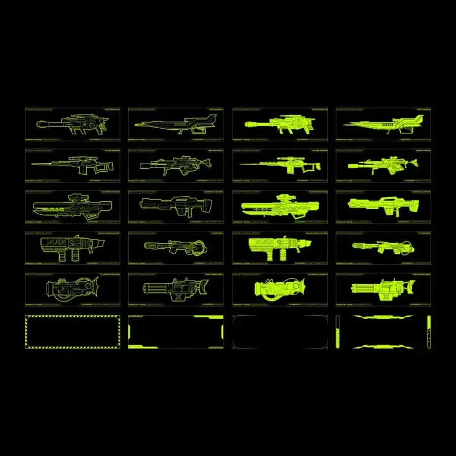 每种武器都有自己的名称和产品代码,用于额外的填充内容,还有 2 种样式可供选择。第一种样式主要侧重于轮廓,使每种武器看起来像一张蓝图。第二种样式更加坚固,使用带有剪切线的填充形状。除此之外,该包还附带 4 个额外框架,可用于放置武器,或在设计工业专辑封面时用于一般用途。如果您不使用 Illustrator,请不要担心。我们还为您提供了 52 个框架和武器的 png 文件。
