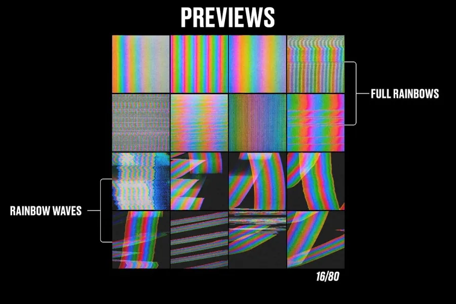RAINBOW_WAVE 此包中充满了扭曲而干净的彩虹,这些彩虹是用模拟设备生成的,显示在 CRT 上,然后被捕获并转换为数字格式。它们可以用作背景、微妙的叠加、纹理或元素。哎呀,将它们放入图像序列中,它可以用作视频中的一些故障转换,自由属于您。