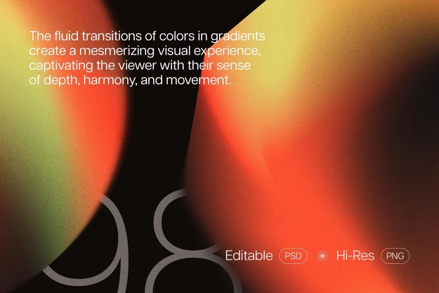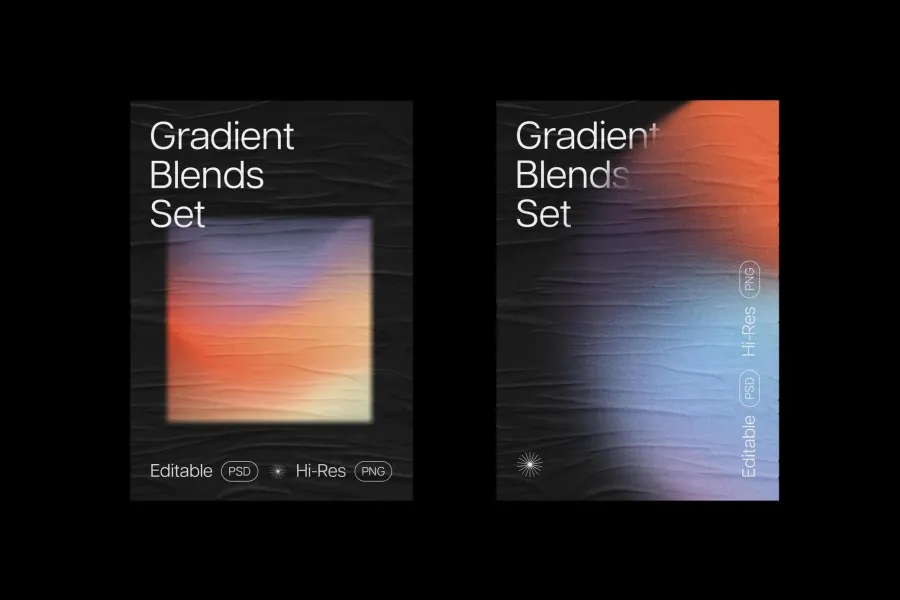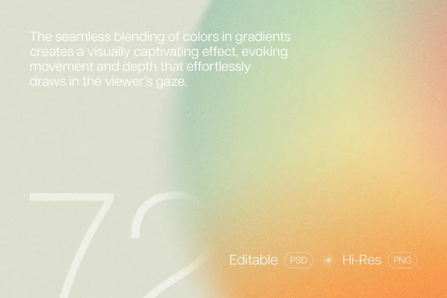 - 36 种渐变纹理,JPG 格式(5000×5000 像素,300 dpi),有噪点和无噪点,涵盖 6 种配色方案;