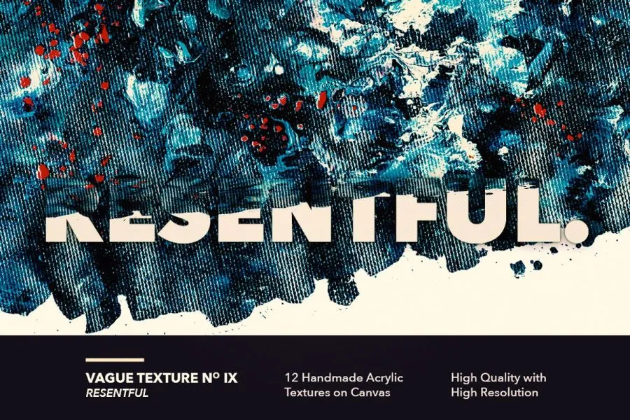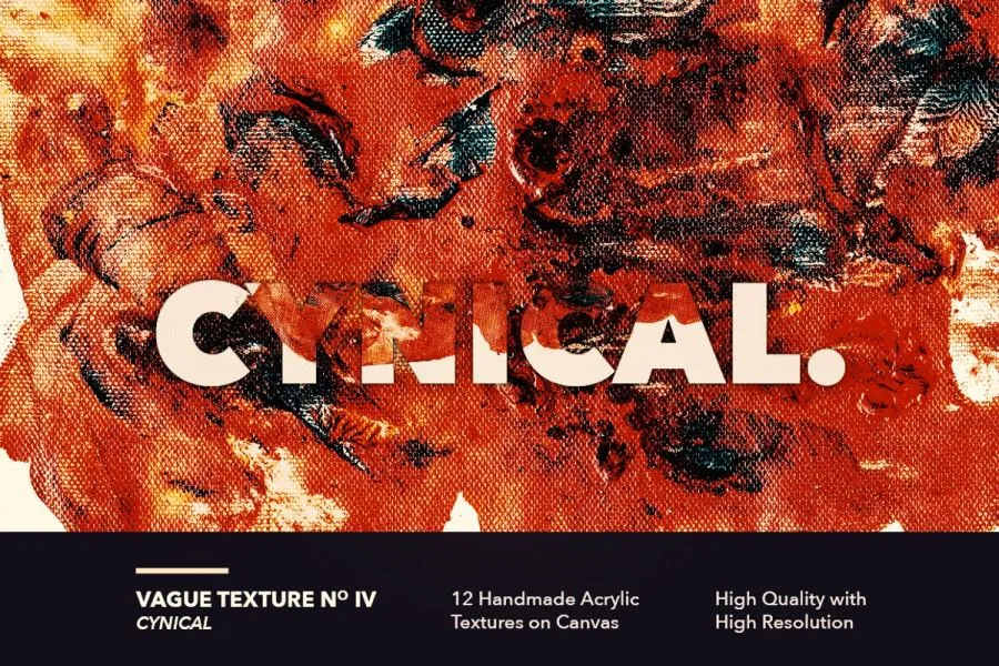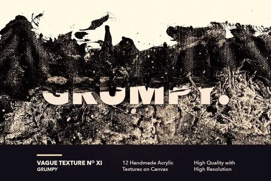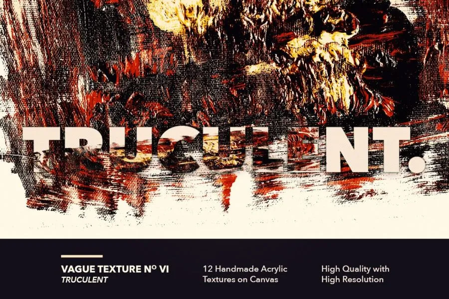 12 种手工制作的亚克力纹理第一卷,纯画布丙烯颜料创作。高分辨率扫描,并使用Photoshop数字化,使其色彩更大胆、更具戏剧性。适用于各种艺术项目,也可与各种字体设计作品结合使用。